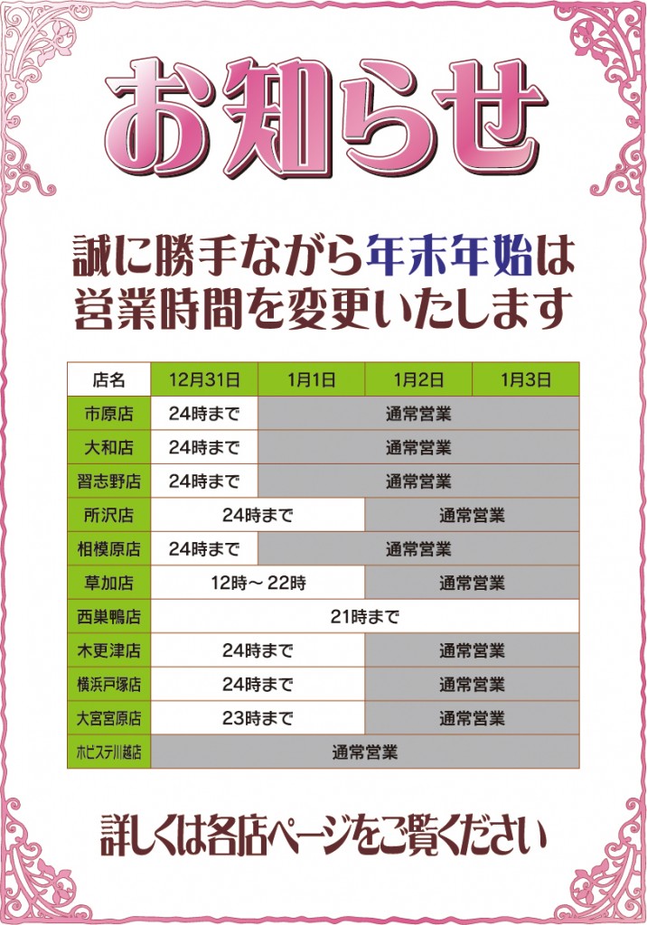 ●ゼスト草加店・・・31日・1月1日の2日間を12時~22時までの短縮営業、あとは通常営業・平日14時~25時、土日11時~25時